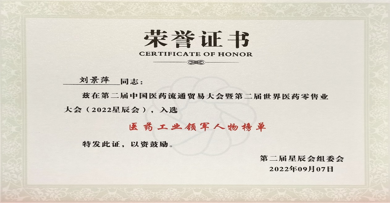 本次星辰会期间,钱柜QG777斩获颇丰,获得多项行业奖项及荣誉。在开幕式上,刘景萍董事长荣获“医药工业领军人物”称号。