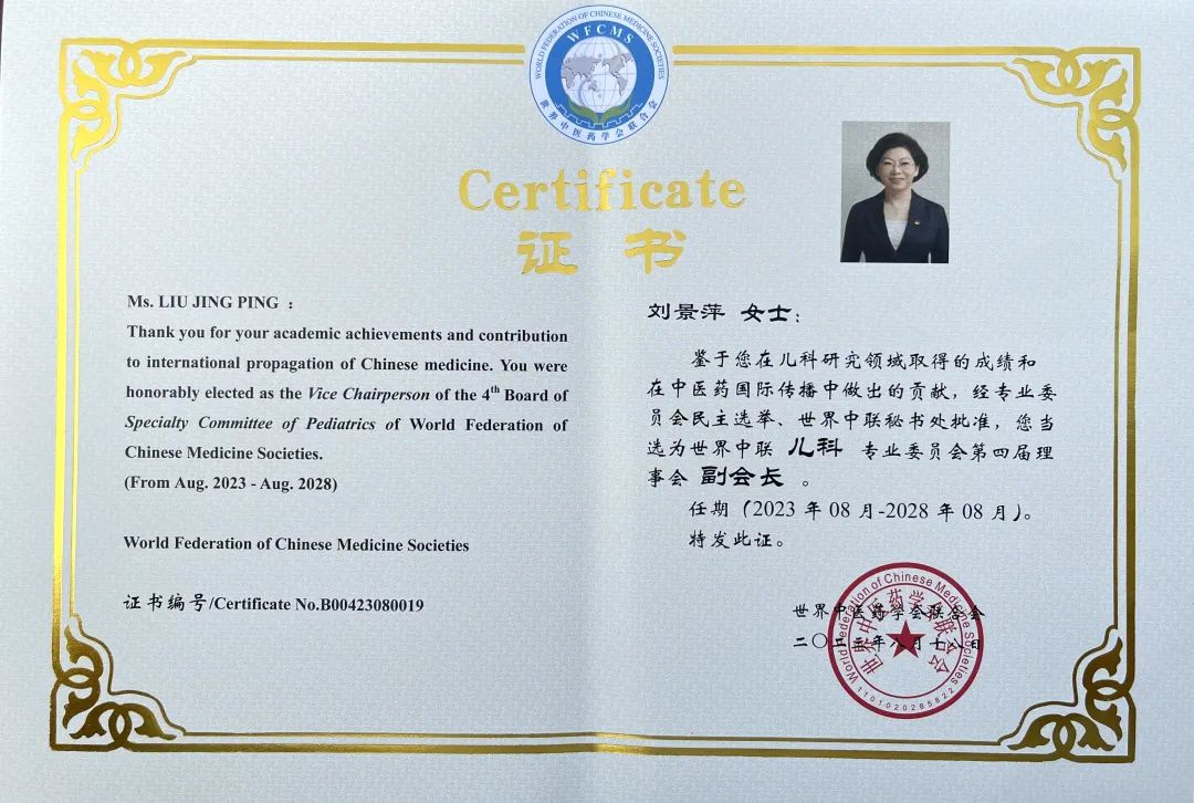 钱柜QG777药业集团党委书记、董事长刘景萍当选世界中医药学会联合会儿科专业委员会第四届理事会副会长