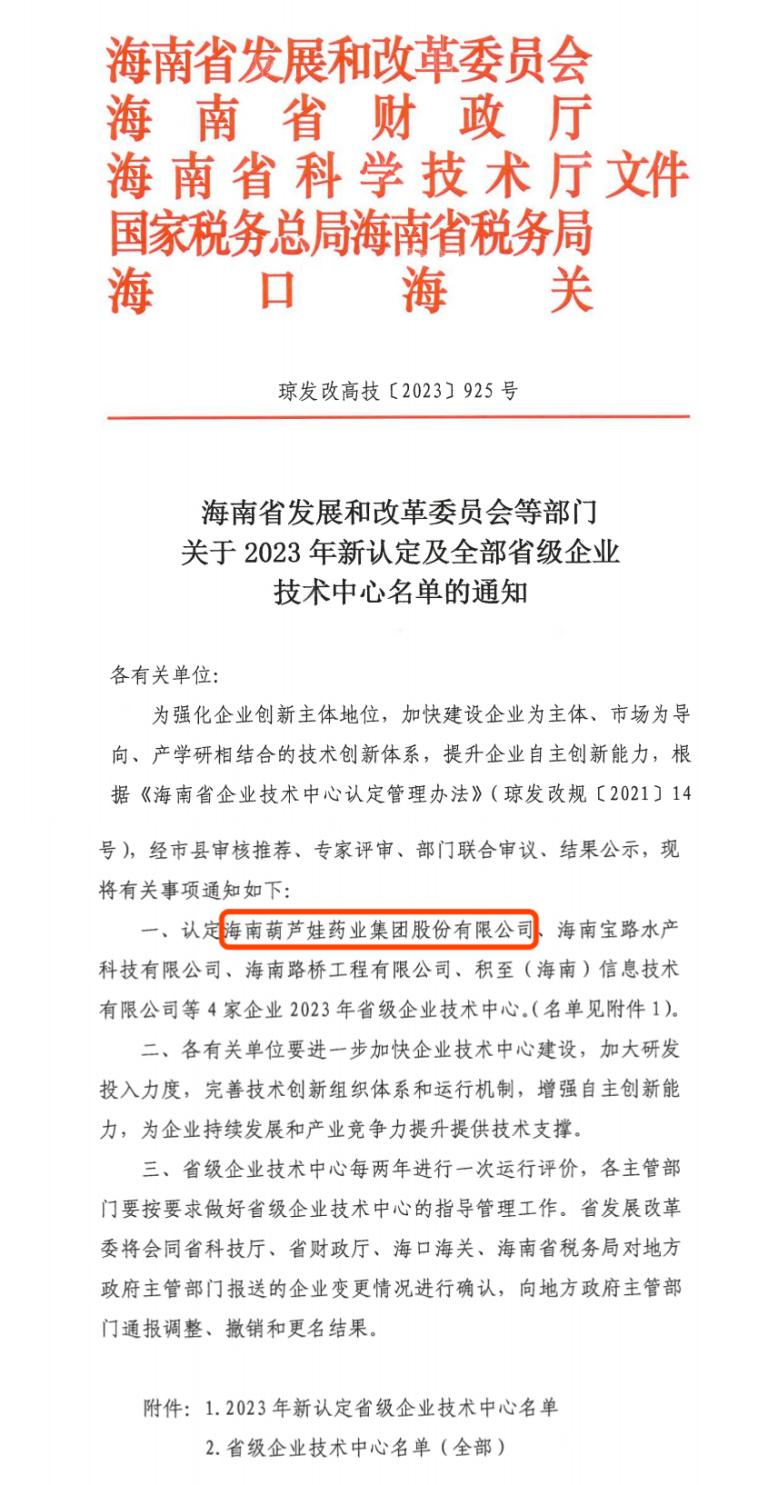 近日,海南省发改委等多部门联合公布了《关于2023年新认定及全部省级企业技术中心名单的通知》,其中,海南钱柜QG777药业集团股份有限公司成功通过评审,被认定为省级企业技术中心,是本次获批的4家企业之一。